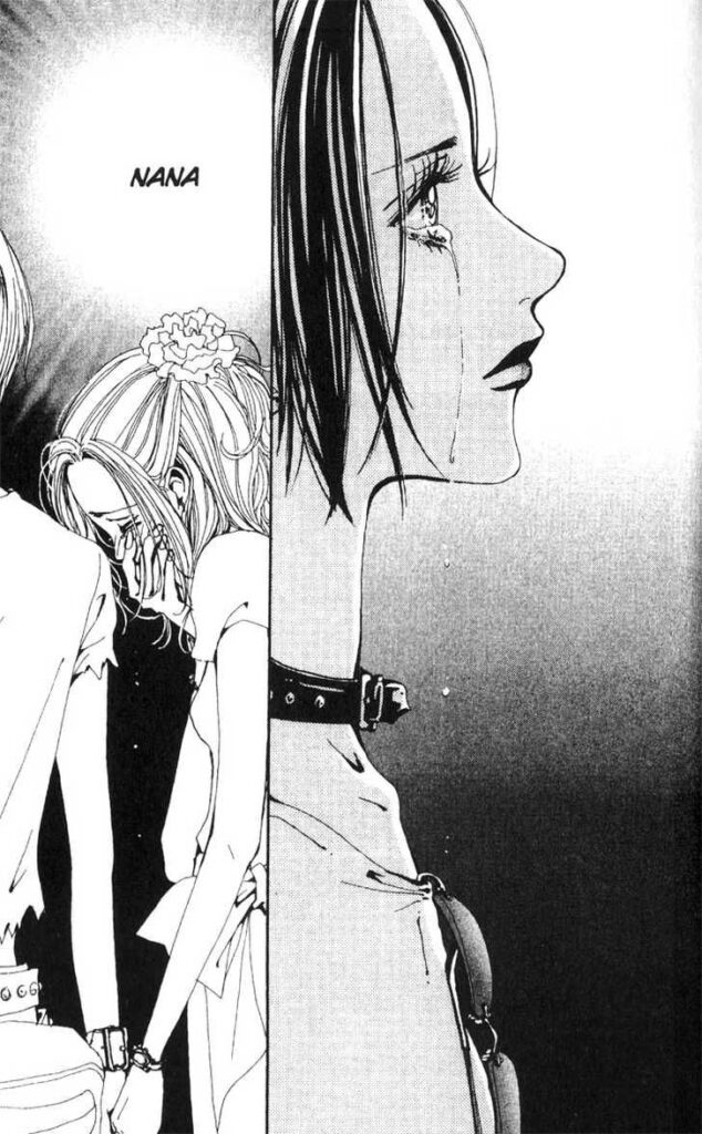 pra quem não sabe, nana conta a história de duas garotas japonesas com o mesmo nome que se conhecem no trem para tóquio. elas são muito diferentes. a nana komatsu é uma garota comum que vem de uma família amorosa e barulhenta, e que gosta muito de se apaixonar. no primeiro volume somos apresentados a todos os relacionamentos que ela teve na vida até chegar no shouji, que se mudou para tóquio e acabou colocando na cabeça dela essa ideia de ir para a cidade grande. é no momento que ela faz essa mudança que ela conhece a nana oozaki, que é uma garota punk que toca numa banda de rock e vai pra tóquio buscando o sucesso na carreira de cantora. depois do encontro no trem, elas só se encontram novamente quando estão procurando apartamento e decidem ficar no mesmo lugar. apesar de terem estilos muito diferentes, elas se tornam amigas rapidamente, e a nana punk apelida a outra nana de hachi, que é o nome daquele cachorro japonês famoso pela sua fidelidade. além disso, nana significa 7, e hachi, 8.